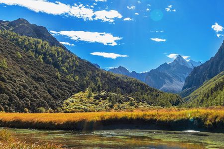 【五色海】藏语为丹增措,海拔4600米,湖面呈圆形。面积0.7公顷)。在光的折射下,产生五种不同颜色而得名,雪山倒影湖面,呈现奇幻的色彩,据传此圣湖能返演历史,预测未来。